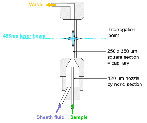 Partec擁有超過40年的流動室設(shè)計經(jīng)驗與技術(shù),其生產(chǎn)的高機械精密度石英流動室內(nèi)徑250um×350um,不易堵塞,散射粒度范圍跨度涵蓋100nm至100μm。其核心技術(shù)是顆粒在高速流經(jīng)流動室時,通過高壓鞘液的包裹,準(zhǔn)確、穩(wěn)定、連續(xù)地通過各個激光的光斑中心,被激發(fā)的熒光信號通過光膠耦合下的大孔徑物鏡被最大程度地接收。高精度石英流動室的專利技術(shù)可保證所有參數(shù)的精確度達(dá)到很高,即變異系數(shù)CV≤2%,樣本采用計算機控制推進(jìn)器技術(shù),其單一方向通過流動室,有效避免了交叉污染。