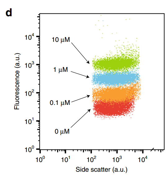 大部分常規(guī)流式細(xì)胞儀的分辨率都在200-500nm之間,無法分析納米級(jí)生物顆粒,例如細(xì)菌、病毒、亞細(xì)胞器和細(xì)胞外囊泡(EV)等顆粒。在檢測(cè)小顆粒時(shí),側(cè)向角散射光分辨率優(yōu)于前向角散射光,首要原因在于大部分流式細(xì)胞儀的前向角檢測(cè)器使用低靈敏度的二極管,側(cè)向角檢測(cè)器和熒光信號(hào)檢測(cè)器都使用了高靈敏度的光電倍增管(PMT)或雪崩式光電二極管(APD),如果前向角也使用高靈敏度的PMT或APD呢?在檢測(cè)納米顆粒時(shí),SSC的效果還是要比FSC好,原因在于如果檢測(cè)顆粒直徑遠(yuǎn)大于入射光波長(zhǎng),即常規(guī)檢測(cè)細(xì)胞的情形,散射光符合米氏散射規(guī)律(Mie scattering theory),散射光的信號(hào)強(qiáng)度和測(cè)量角度密切相關(guān),前向角的檢測(cè)效率優(yōu)于側(cè)向角,但如果在檢測(cè)納米顆粒時(shí),直徑遠(yuǎn)小于入射光波長(zhǎng),符合瑞利散射規(guī)律,檢測(cè)角度并不是影響散射光效率的因素,側(cè)向角的背景信號(hào)會(huì)遠(yuǎn)低于前向角,所以SSC在檢測(cè)納米顆粒時(shí)分辨率會(huì)比FSC更有優(yōu)勢(shì)。